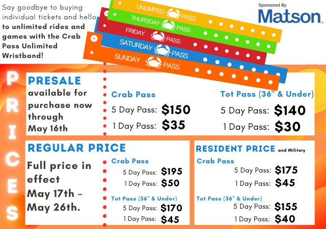 Thanks to Matson, new to Crab Fest this year will be 509 Jumpers from Yakima, WA! 509 Jumpers is an inflatables company that will be bringing numerous games, bounce houses, slides and obstacle courses for endless family fun during Crab Fest. Presale Wristbands are on sale now through May 16th, you can scroll down for more information.