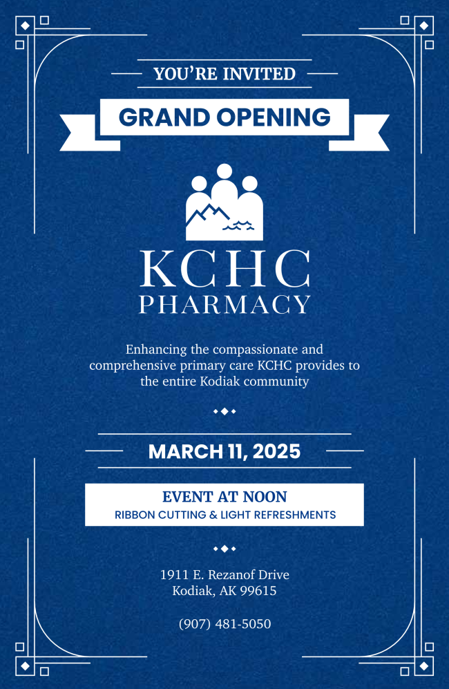 [Kodiak, Alaska] – [March 5, 2025] – Kodiak Community Health Center is proud to announce the grand opening of its new in-house pharmacy, a vital addition to KCHC designed to enhance patient care and convenience. The event will take place on Tuesday, March 11, 2025 at 12 noon, located at 1911 East Rezanof Drive in Kodiak. Community members are invited to attend the grand opening and ribbon-cutting ceremony.