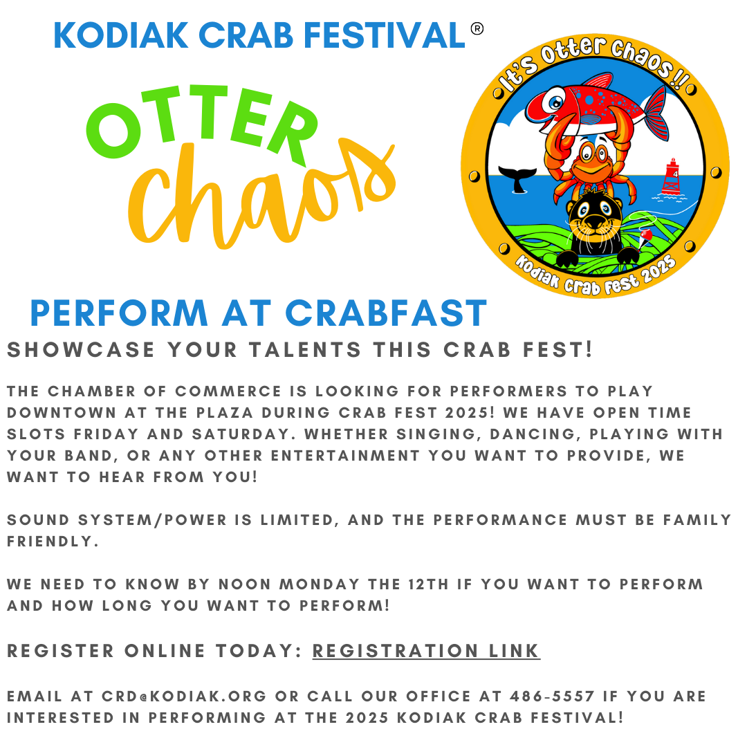 Singing, dancing, musical acts, bands, and entertainers....if you're planning on performing during the Kodiak Crab Festival this year please register below! | |