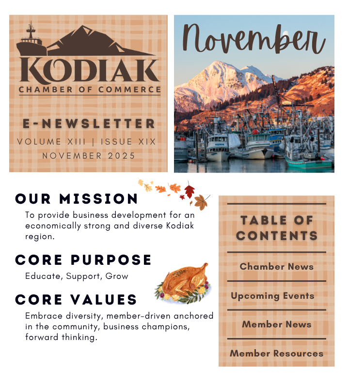 Below you’ll find some information on a few of our upcoming events and member services, on the 2026 Relocation Guide and HOME SHOW which we're so excited about. Inside this newsletter you’ll also find the Chamber’s Goals outlined from our recent Strategic Planning Session in September. Behind the scenes we are working on our Annual Holiday Decorating Contest, the Relocation Guide, and event planning for ComFish, Crab Fest and the Kodiak Home Show at the end of February.