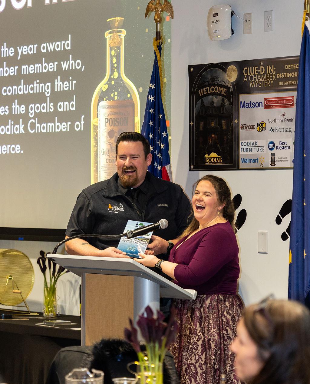 Each year we receive multiple nominees in all categories, and the decisions can be pretty tough to make. Typically, there is only one award winner in each category, except for this year. This year we gave the Business of the Year Award to two different businesses. Both businesses were equally deserving of the recognition in different capacities and because of that, both Kodiak Furniture and Bearfoot Bakery won the 2025 Business of the Year. This is the second year that we’ve awarded an “Excellence in Customer Service Award”, which went to a very deserving Kodiak Hana team. This year’s Cornerstone Award was given to KANA for the Kodiak Marketplace, also incredibly deserving of that specific award for all that the Marketplace has done and will continue to do for our business community and our community overall. Scroll down to see the full list of this year’s award winners and for a look at some of our photos from the dinner below. Watch for more to come on our facebook page this weekend!