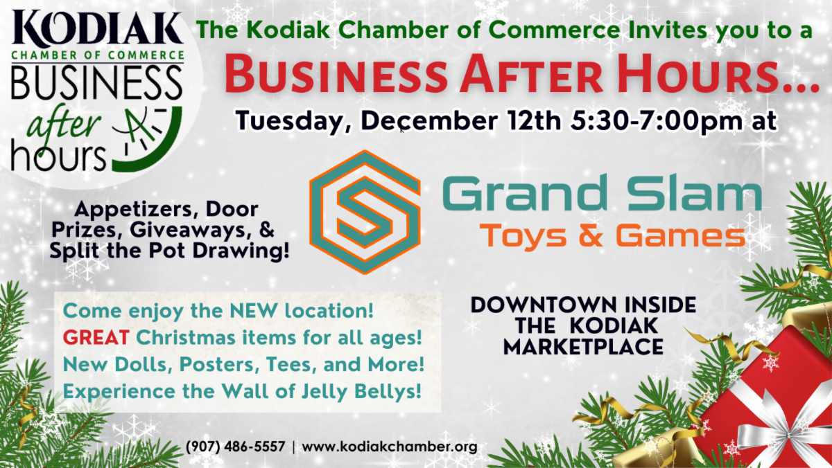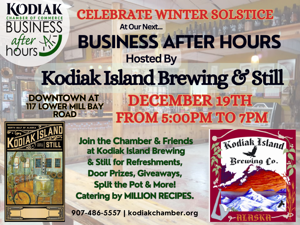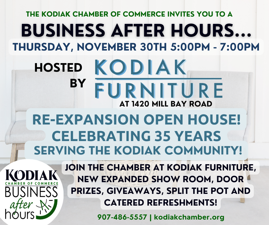 TONIGHT there is a Business After Hours at Kodiak Furniture starting at 5pm in their newly expanded showroom celebrating 35 years in business with an Open House! In December we'll have another Business After Hours at Grand Slam Toys & Games in their new location downtown at the Kodiak Marketplace, followed by our last Business After Hours of the Year Celebrating Winter Solstice at Kodiak Island Brewing & Still.