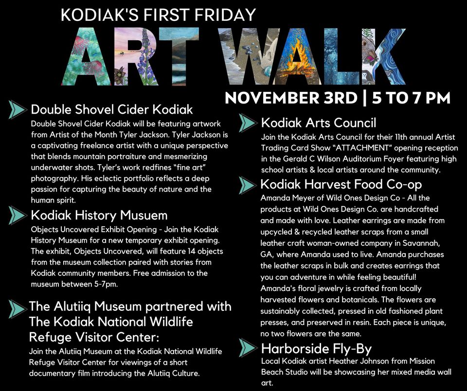 October and November have a lot to offer when it comes activities and events in Kodiak. I hope you will find time to look at the events mentioned in this newsletter as well as the Member benefits available. We are a new staff at the Chamber office and have much to learn, but we are motivated and dedicated to stepping up to do as much as we can to support our members. There is a Business After Hours tonight starting at 5pm Alaska Groundfish Data Bank, some GREAT Moonlight Madness Sales throughout the community tomorrow, the Made in Kodiak Fall Harvest Market takes place on Saturday, the Chamber will host our Annual Meeting & Awards Recognition Dinner on Saturday, then next week we end the month with a Downtown Trick or Treat.