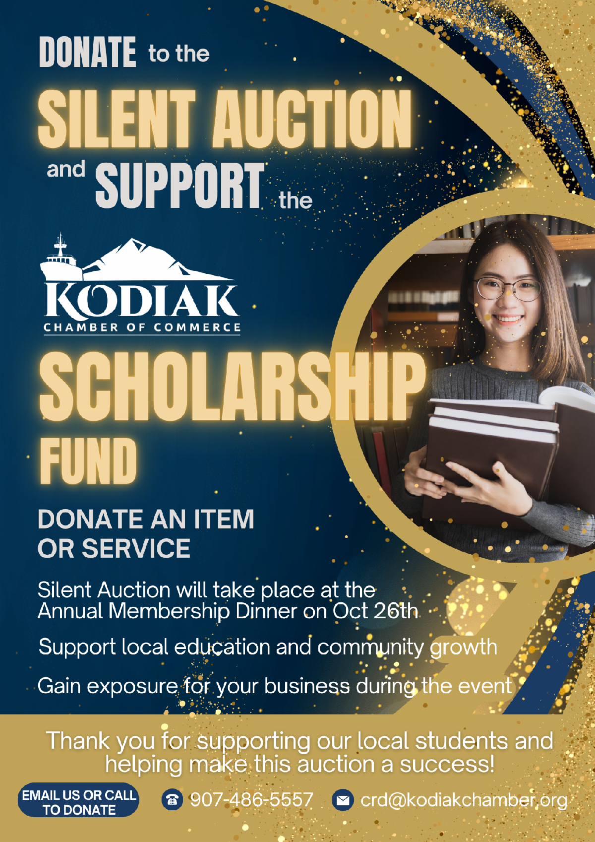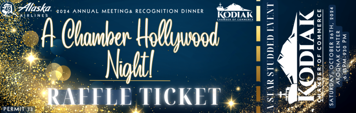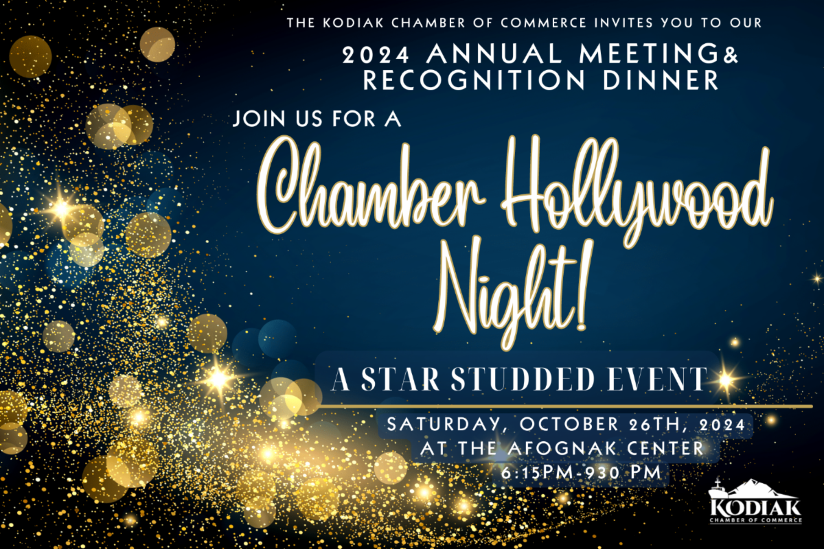 We’re incredibly excited about this year’s Annual Meeting & Awards Dinner theme, "A Chamber Hollywood Night” A Star Studded Event where we’ll be celebrating some of our Kodiak Chamber Stars. Tickets for the dinner on Saturday, October 26th are on sale now. Click here to get yours. You can also purchase raffle tickets through the same link for $25 each or 5 for $100 to win $2,500 or 2 Round Trip Tickets on Alaska Airlines, only 500 tickets are available for purchase. We’re accepting Silent Auction donations for our annual dinner, please reach out to Ericka Thompson, our Community Relations Dinner if you’d like to contribute to the Silent Auction this year. Last year we raised over $4,000 for the Chamber’s Scholarship fund at our annual dinner, we’re hoping we can do more of the same this year. Join us at our dinner to find out who this year’s Recognition Award Winners will be.