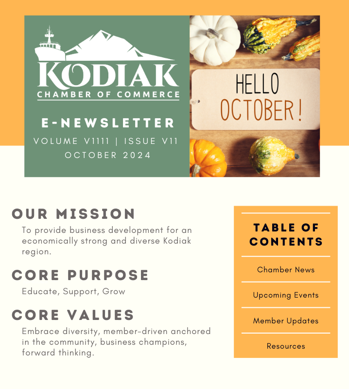 Despite the shorter days ahead, the Chamber remains committed to fostering a strong, resilient business environment in Kodiak. Our staff is available to assist you with any needs as we navigate the winter season together.