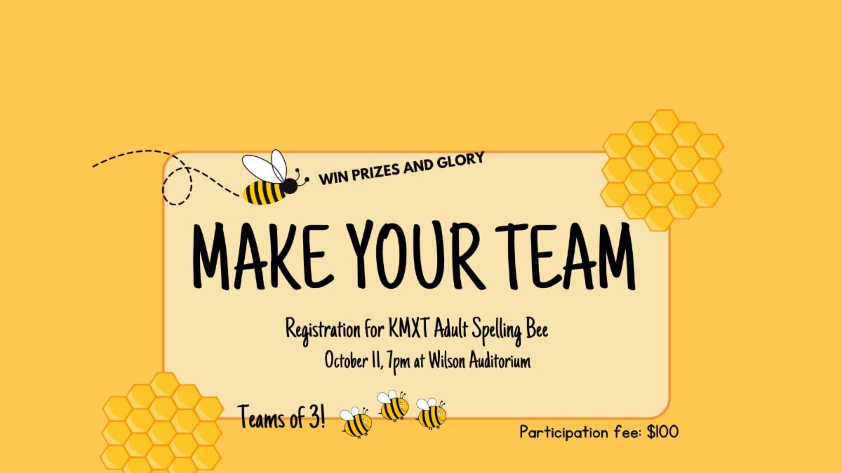 Teams of three will compete for the Kodiak glory in this first-ever KMXT Adult Spelling bee. Competitors will work with their team to correctly write the word or risk elimination from the competition. All participants must be 18+ an out of high school. | |