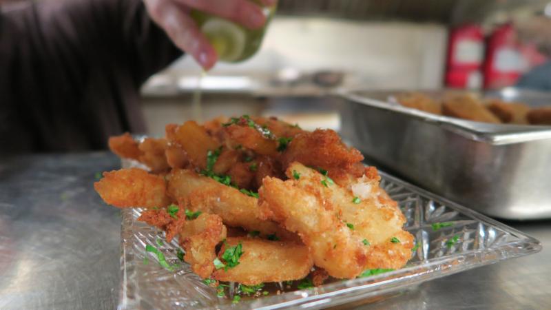 East Intervale IPA Battered Fish and Chips, featuring Square Tail Stout and Iron Mike Pale Ale on draught.