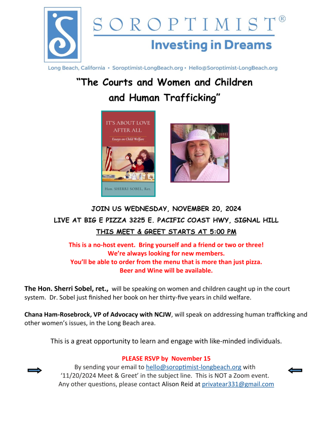 As this flyer from Soroptimist Long Beach says, this is a great opportunity to learn and engage with like-minded individuals! AND support two of our dear member/leaders, the Honorable Sherri Sobel, a retired judge, and Chana Ham-Rosebrock, our VP of Legislation and Advocacy. Feel free to download and print the flyer, and RSVP to hello@soroptimist-longbeach.org by November 15 with "11/20/2024 Meet & Greet" in the subject line.