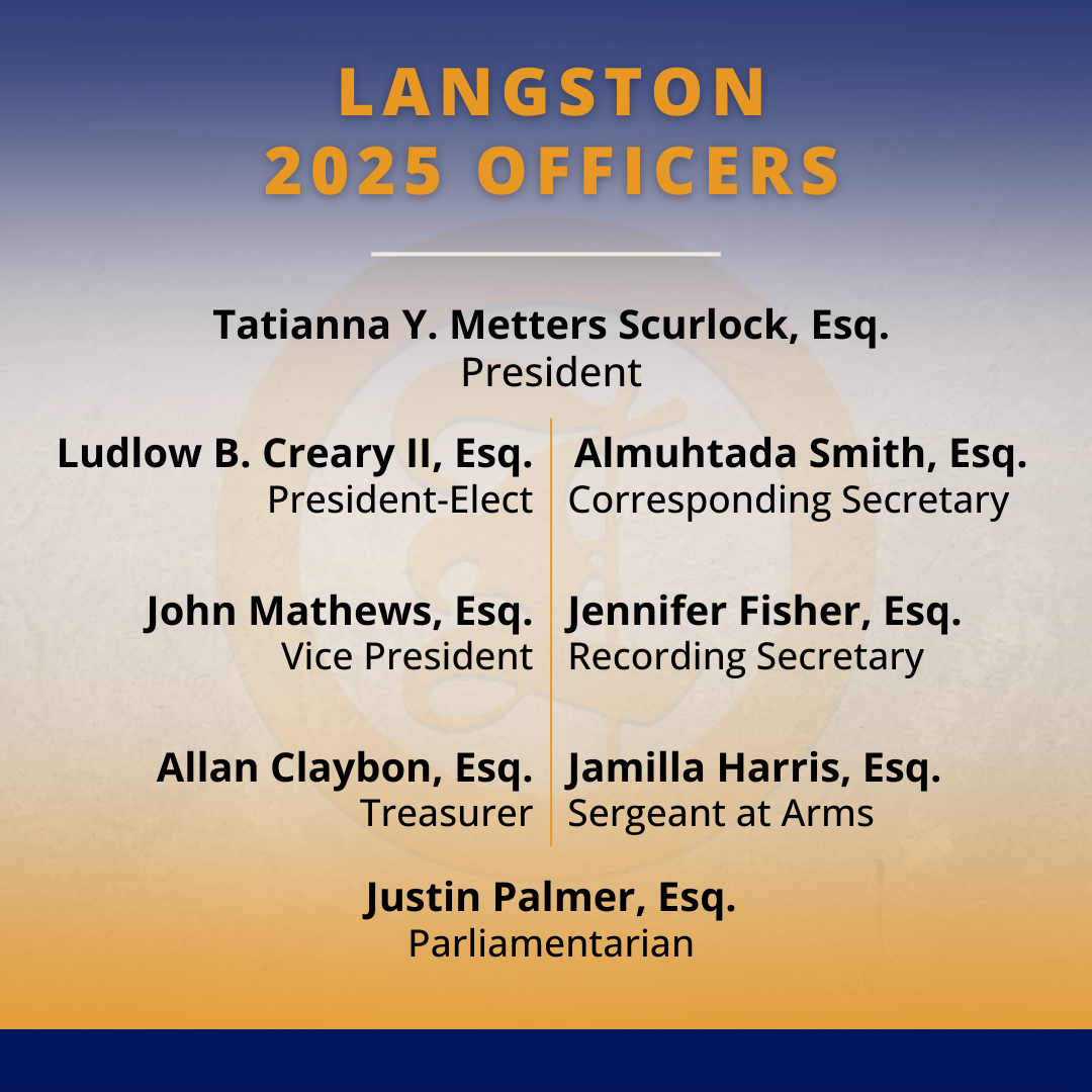 I want to congratulate our stellar outgoing President Melvin Felton, who led this organization in achieving considerable success in serving and enriching our community and has now passed the baton to me. Joining me on the front line is our 2025 board – comprised of prominent and compassionate legal professionals who have exhibited an unwavering commitment to the pursuit of justice, equality, and professional enrichment in line with Langston’s mission.