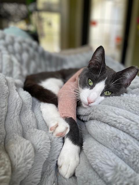 Cindi had just attended an educational seminar to learn about a newer wound dressing, a transforming powder dressing (TPD), that helps wounds heal from the inside out. She contacted the manufacturer, and they sent free TPD for the cat, whose wound healed completely in 60 days!