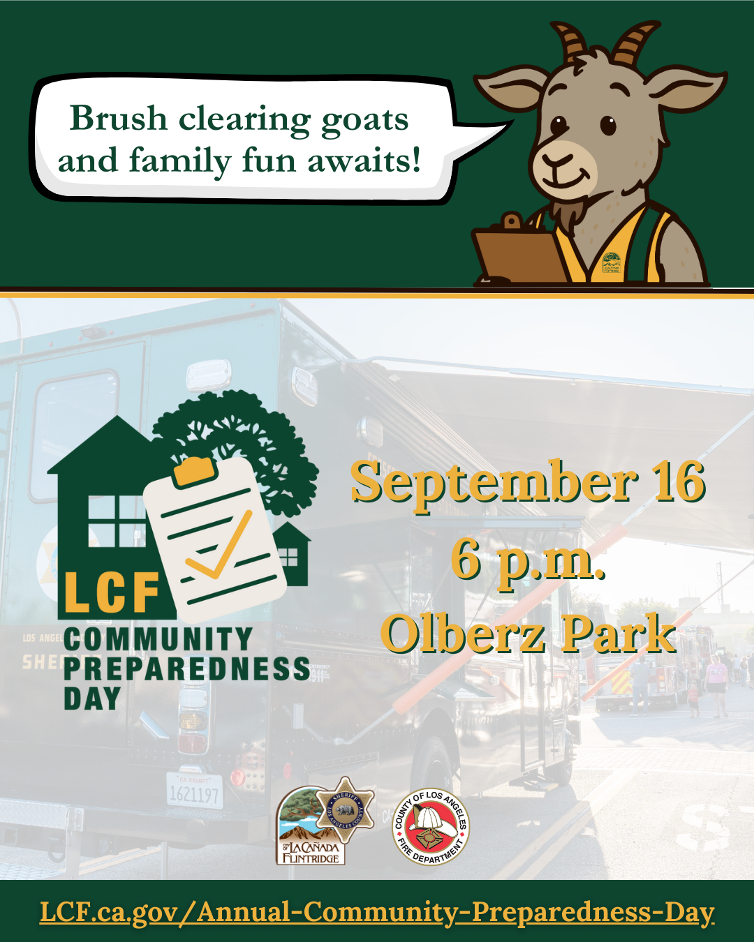 Get prepared the G.O.A.T way and leave prepared, not panicked! Learn more: LCF.ca.gov/Annual-Community-Preparedness-Day.