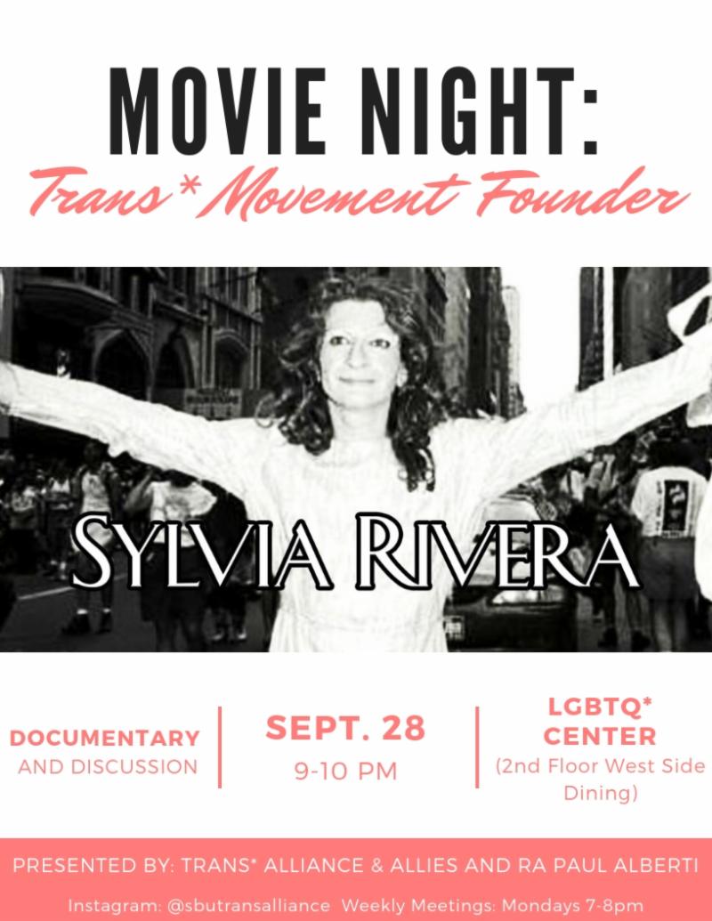 Trans* Alliance and Allies will be screening a short documentary about Sylvia and having a discussion about her work and identity. Sylvia was a Latina Trans* activist in the late 1900s. She, along with Marsha P. Johnson, are credited with starting the Stonewall Riots.