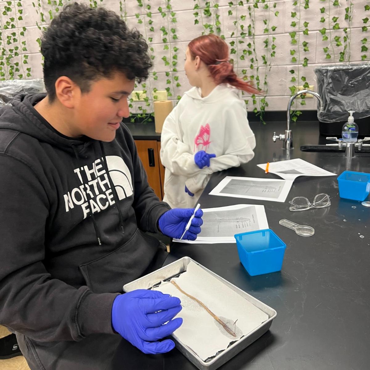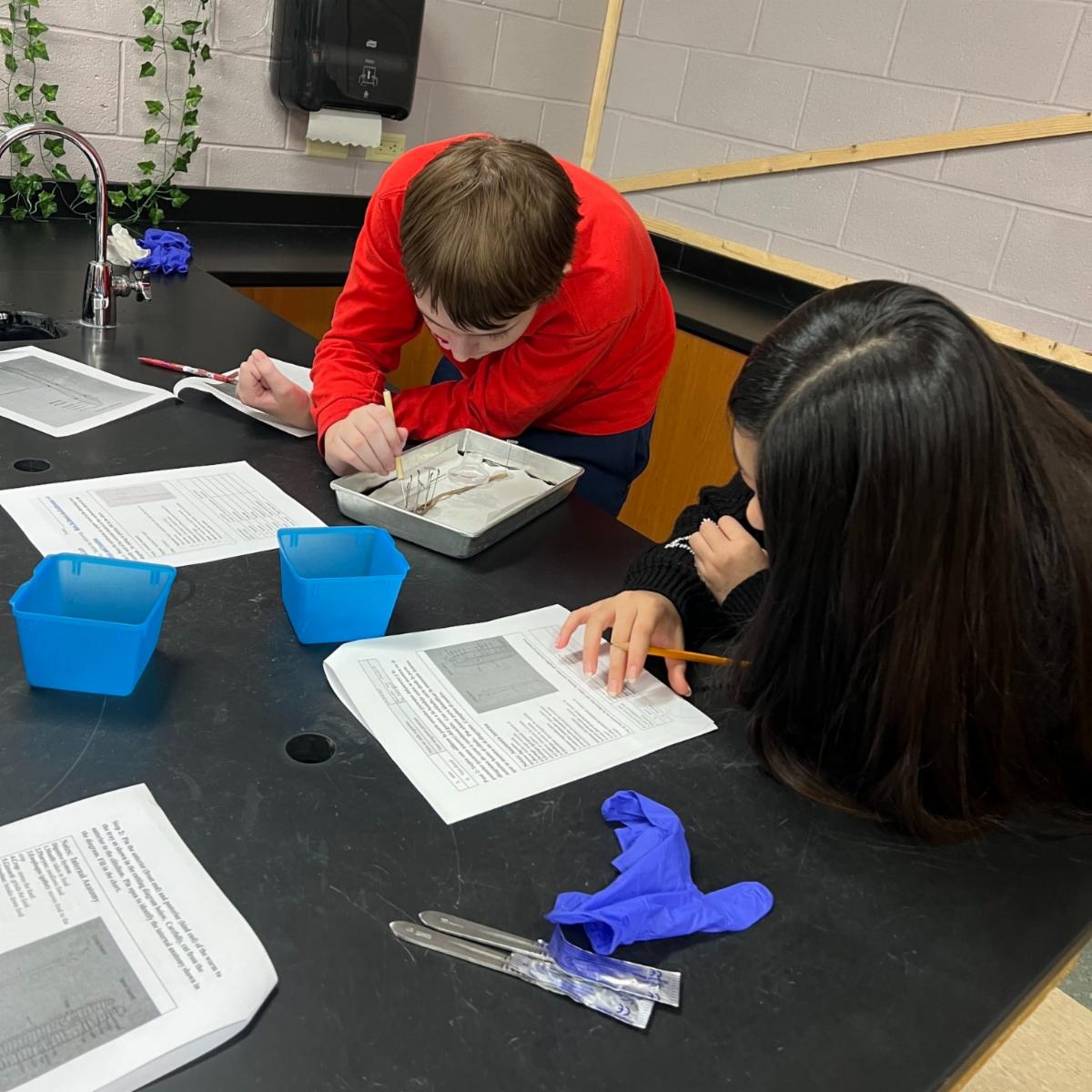 In seventh-grade science at Lake Geneva Middle School, students have been learning about mollusks, segmented worms, arthropods, and echinoderms. Last Wednesday, they dissected worms. Students first identified the different body parts of the worm and their function. Then, they set up their worm dissections and were able to view the internal parts of the segmented worm. Great job! | |