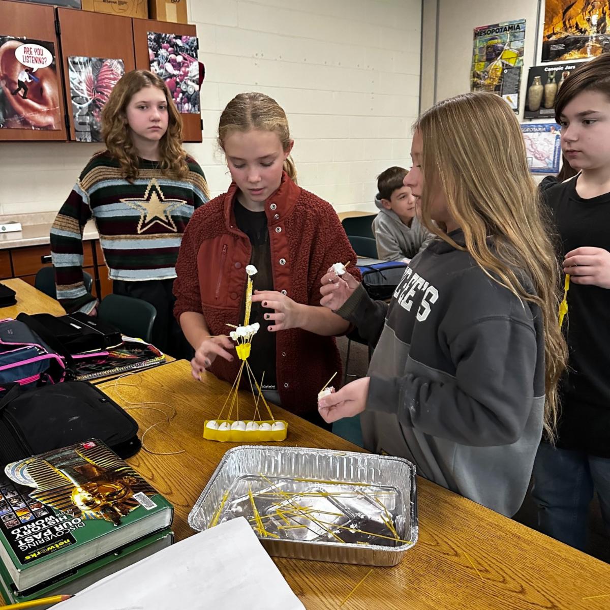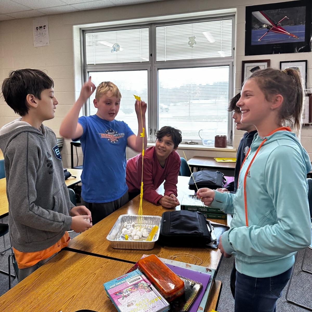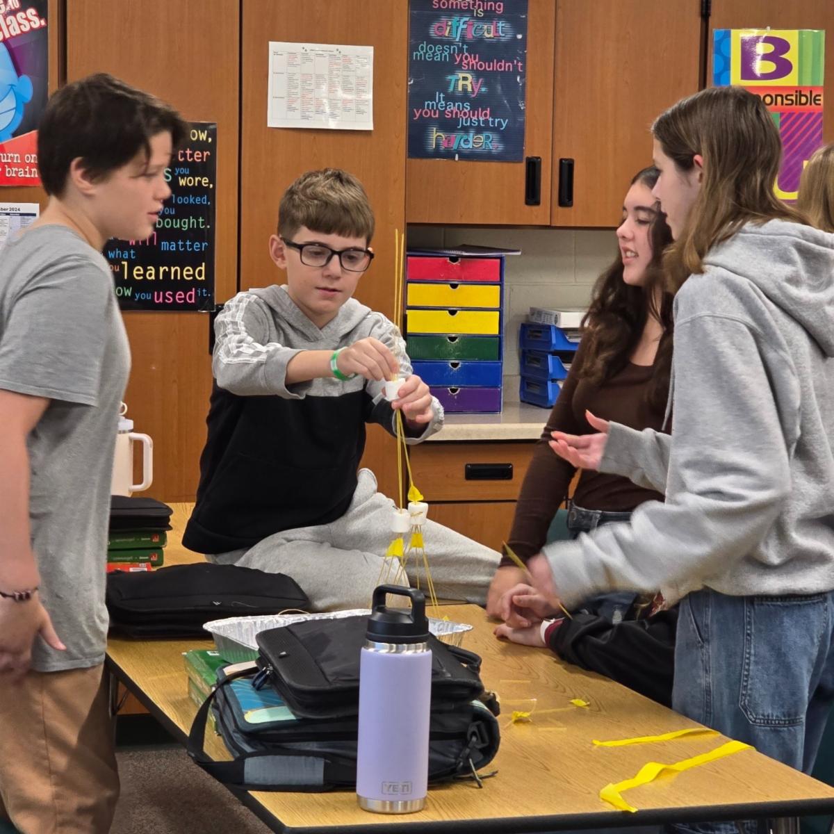 Sixth grade students participated in guidance lessons with Mrs. Kidwell at Lake Geneva Middle School. They are learning about conflict resolution and participating in lessons on our Character Strong Curriculum. Students had to work together to build the tallest tower using marshmallows, spaghetti noodles, tape and string. | |
