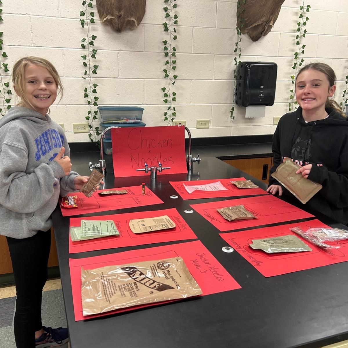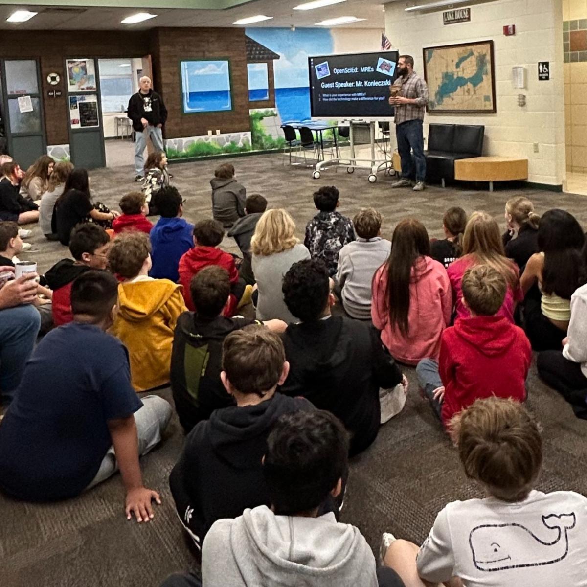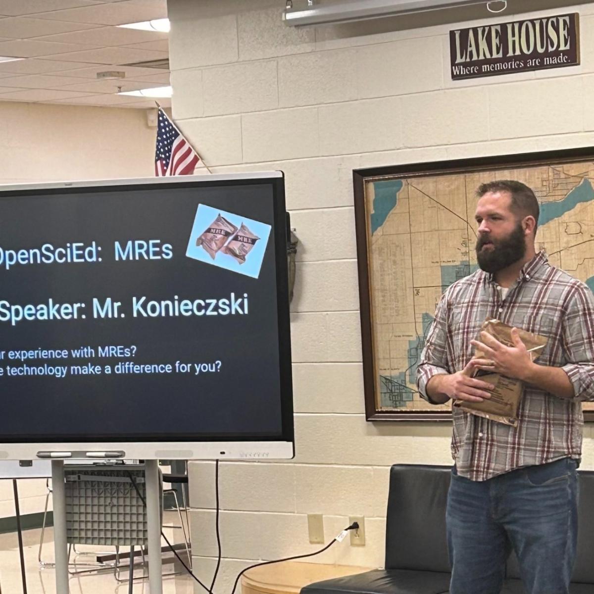 Lake and Olympus House science classes at Lake Geneva Middle School are investigating flameless heaters in a Meal, Ready-to-Eat (MRE) that provides hot food to people by just adding water. To tell us more about his experience with MREs, guest speaker Mr. Konieczski explained how this technology made a difference to him while he served in the U.S. Navy. Thank you for sharing your story with us and for your service. | |