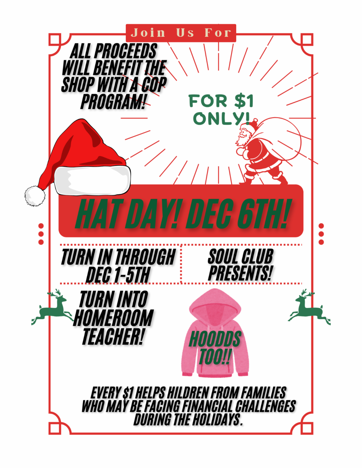Hope Squad is hosting Penny Wars the week of December 2-8. This will be a grade level competition. The grade with the most money raised will earn a treat. All proceeds will help sponsor a family in need for the holidays.