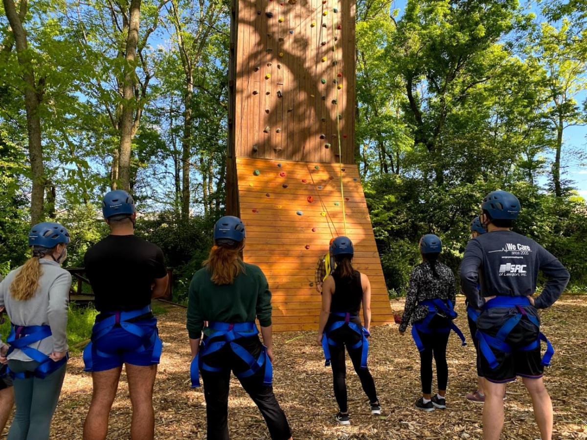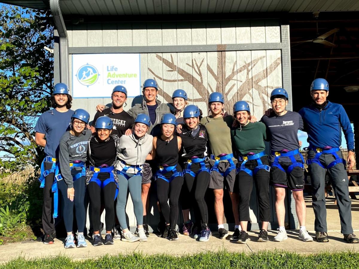 Over two dozen first year UK College of Medicine medical students capped off the academic year by participating in the Lexington Medical Society’s Adventure Event at the Life Adventure Center in Versailles on May 12th and May 28th. The first-year medical students, who had been on campus only 3 or 4 times this past year due to the pandemic, were excited to be together taking on the challenge of climbing a 60-foot wall, negotiating a high-ropes course, and taking a zip-line back to the ground. A fun time was had by all.