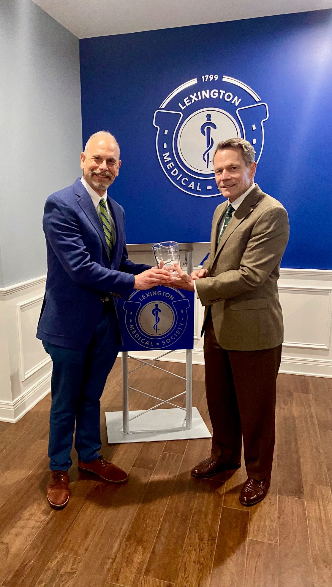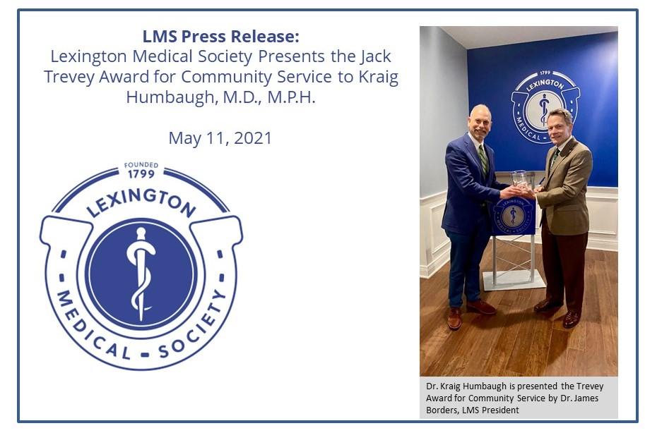 Kraig Humbaugh, M.D., M.P.H., Lexington-Fayette County Commissioner of Health, was presented the Jack Trevey Award for Community Service by James Borders, M.D., Lexington Medical Society President, on May 11, 2021. This award is the Society’s highest honor and is not presented every year but only when a worthy recipient is selected. Dr. Borders, during the award presentation, stated, “Dr. Kraig Humbaugh calmly guided our community through the CoVID-19 pandemic from the first indication of the virus to the vaccination efforts. His leadership represents the best in the practice of medicine and an inspiration to us all.”