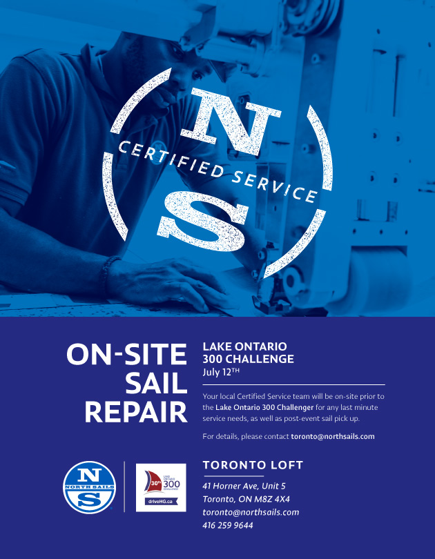 Your local North Sails Certified Service team will be on-site at PCYC prior to the Lake Ontario 300 Challenge starting on Friday, July 12th for any last-minute service needs, as well as post-event sail pick up. For details, see North Sails On-site Sail Repair.