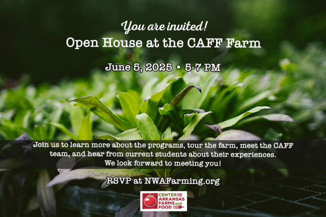 Come visit the Center for Arkansas Farms and Food (CAFF) Farm in Fayetteville on Wednesday, June 5 from 5:00–7:00 PM for their annual Open House! This is a great chance to tour the farm, meet the CAFF team, and learn more about their training programs. The guided tour will begin at 5:30 PM—don’t miss it!