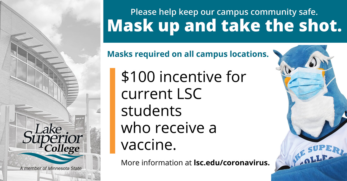 Safety remains our highest priority. Masks/face covering continue to be required inside all public spaces on all Lake Superior College campus locations, regardless of vaccination status.