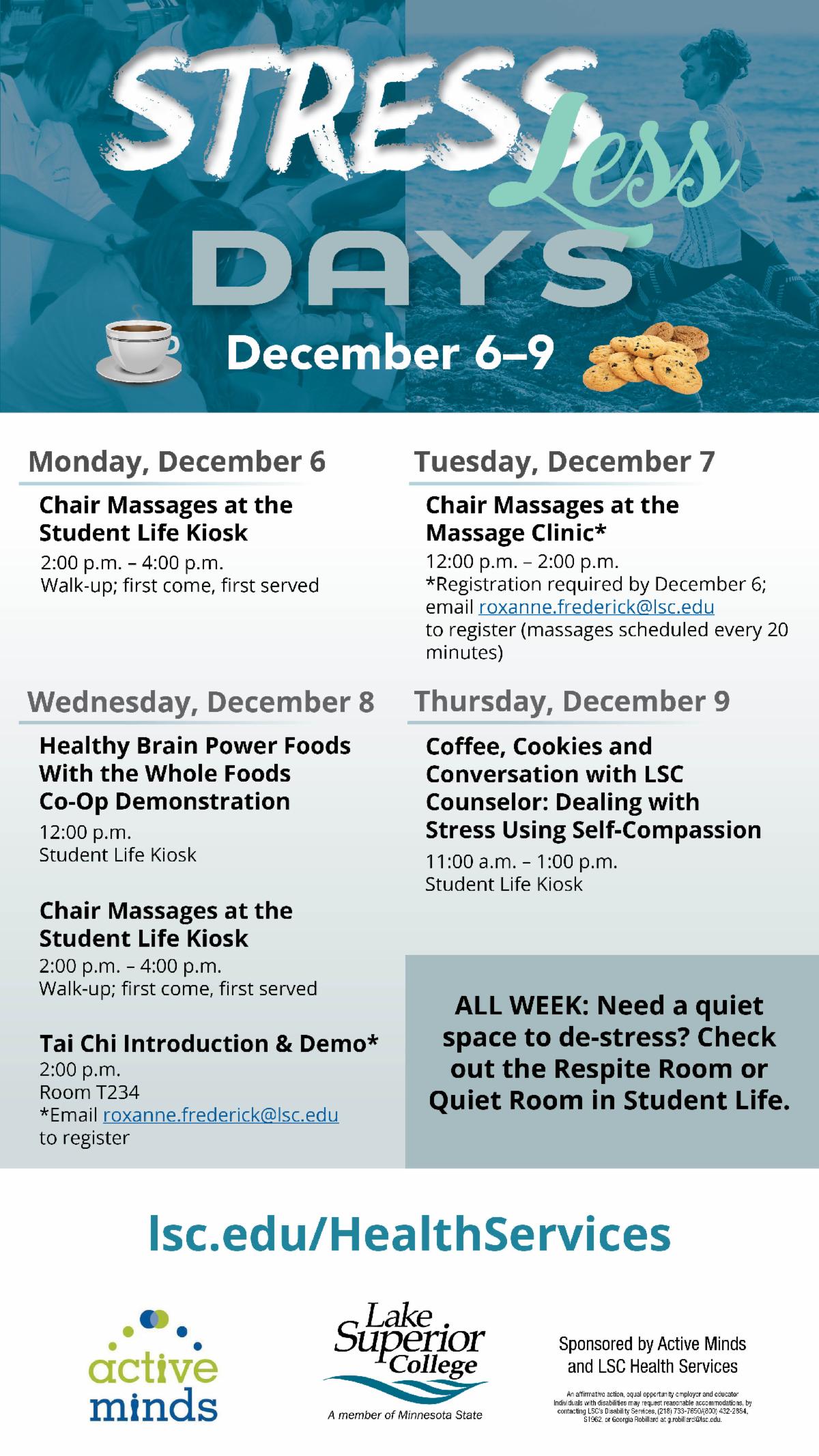 - Stress Less Days are December 6-9. Check out the schedule of activities to help you relax and focus on your physical and mental well-being. Details at lsc.edu/healthservices.