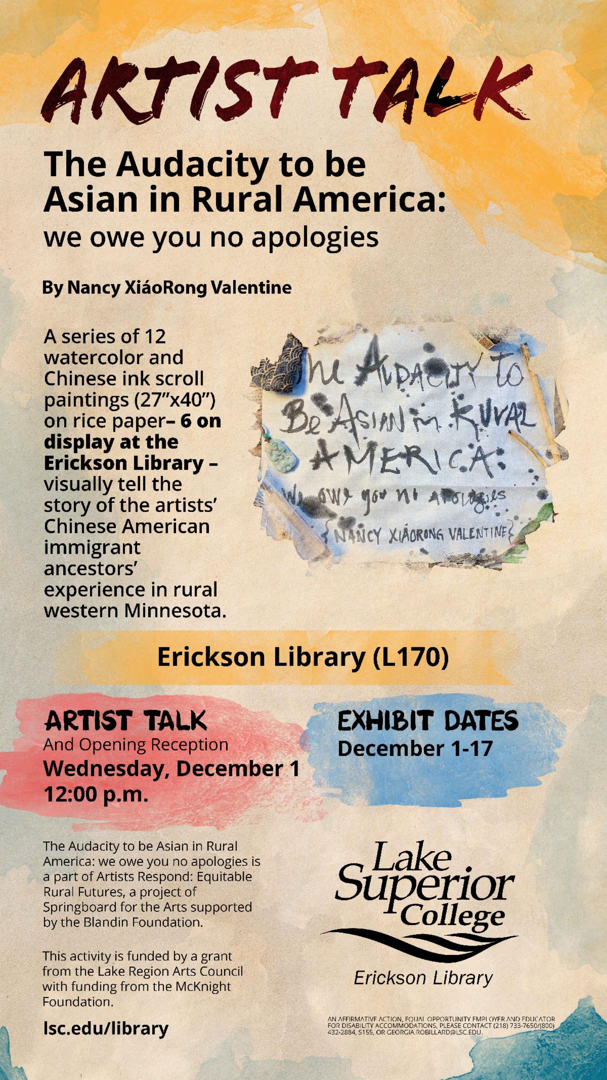 - The Erickson Library will host an art exhibit titled, The Audacity to be Asian in Rural America: we owe you no apologies, December 1-17. They will also host an Artist Talk with the artist Nancy XiáoRong Valentine on December 1 at 12:00 p.m. Read more about the artwork at lsc.edu/library.