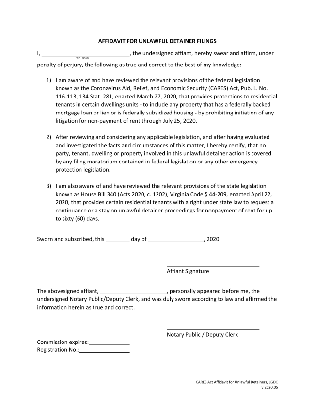 LSNV attorneys recognized that ascertaining whether a landlord’s property was covered could easily present a problem in court, particularly for low-income, unrepresented tenants. So they got to work! They teamed up with the Virginia Poverty Law Center and the Virginia Legal Aid Crisis Response Committee, and after a month of advocating, Loudoun, Arlington, and Falls Church City have now adopted a policy requiring each landlord to file a CARES affidavit, attesting that theirs is not a covered property. The affidavit will help protect the rights of pro-se tenants who may be unaware that a moratorium is in place. Moreover, it is expected that the affidavit requirement will decrease the number of eviction cases filed during the moratorium and therefore, benefit not only LSNV’s clients and other low-income persons, but the judicial system as well.