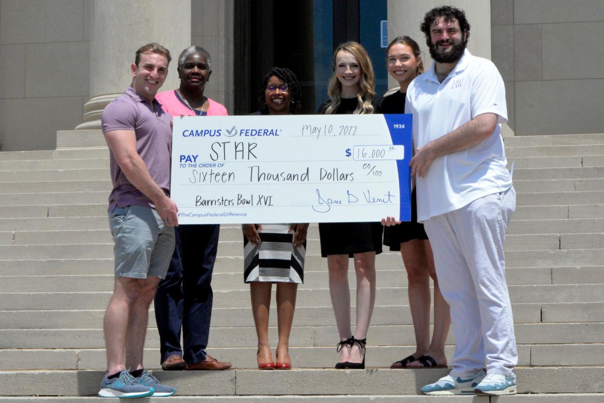 On May 10, LSU Law 3L and Purple Team Captain Rory Luke, along with 3L and Gold Team Captain Christopher Melancon, 3L and Cheer Captain Hannah Wilson, and Professor Darlene Goring, presented a $16,000 check to STAR Staff Attorney Becca Wheelis and Managing Attorney Airzola Cleaves on the steps of the old Law Center.