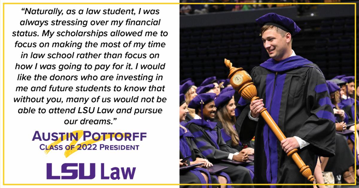 “I wanted to become a lawyer to give children somebody who is going to fight for them,” said Pottorff, who earned his undergraduate degree in criminal justice at McNeese State University. “I know that with divorce, adoption, or any kind of lawsuit involving children, the children are the ones who normally take the biggest hit. My little sister was adopted when she was four and she has been a constant inspiration for me to become a lawyer.”