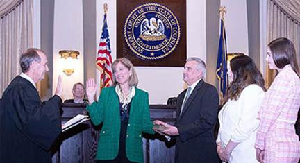 The Louisiana Supreme Court held the official investiture ceremony for Koclanes on May 9 at a ceremony in the Supreme Court courtroom at the Chief Justice Pascal F. Calogero, Jr. Courthouse. With her husband, children, parents, close family, and friends in attendance, Koclanes was sworn in by Louisiana Supreme Court Chief Justice John L. Weimer (’80) after an introduction by Justice Jay B. McCallum (’85).