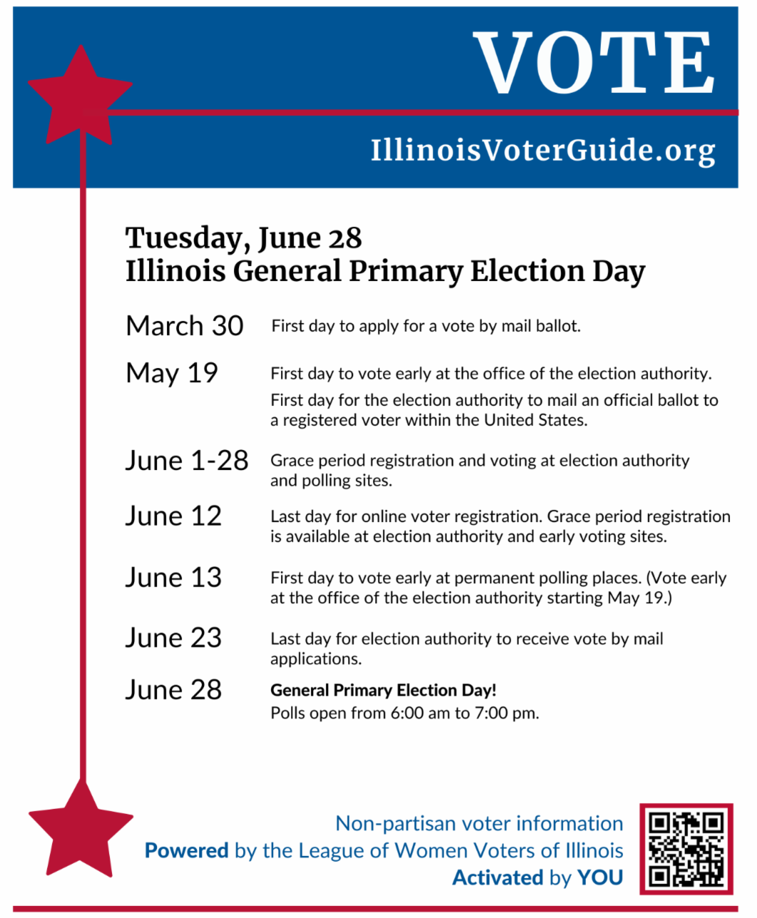 June 28: General primary election day! Mailed-in ballots must be postmarked by this date. Voters may also drop off vote by mail ballots with their election authority or in a drop box. Check with your election authority for locations.