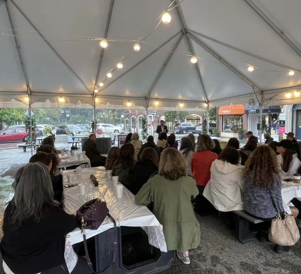 Thank you to Marcy Berman-Goldstein and the Scarsdale Business Alliance for allowing the League to use the wonderful dining tent in the Village Center for our Membership Coffee and to Scarsdale Mayor Justin Arest, for joining us, speaking, and answering our community’s questions. Thank you also to Deputy Mayor Randall Whitestone, Board of Education Vice President Suzie Hahn, and Board of Education Member Amber Yusuf for attending the Coffee.