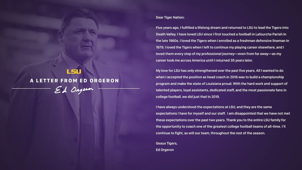 The termination agreement also includes media appearance stipulations, with Orgeron required to make at least one public appearance on behalf of LSU per year through 2025. It's not specified what form those appearances might take. The school will also retain the ability to use Orgeron's name and likeness in media and promotional materials throughout the course of the agreement