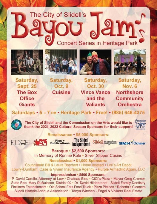Bayou Jam Concert Series The concert starts at 5 p.m. in Heritage Park and admission is free!