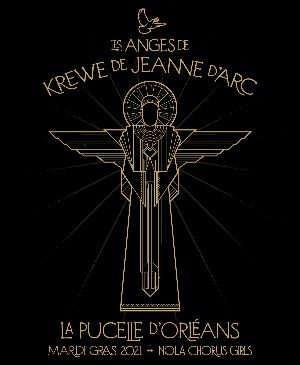 But in these difficult COVID times, the Chorus Girl Project dance troupe is shut down, and, like so many professional performing artists, leaders Amy Johnson and Laura Manning are professional dancers whose careers have been furloughed due to COVID restrictions. We really missed the Chorus Girl Angels in our Tableaux this year, and they really missed us. They've created this beautiful T-shirt design as their alternative COVID participation in the Krewe de Jeanne d'Arc. This shirt is a fundraiser for both the Krewe de Jeanne d'Arc and the Chorus Girl Project.