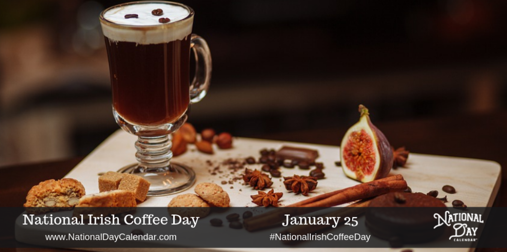 National Irish Coffee Day kicks off January 25th each year with a mug of strong coffee, Irish whiskey, sugar, and topped with a layer of cream.