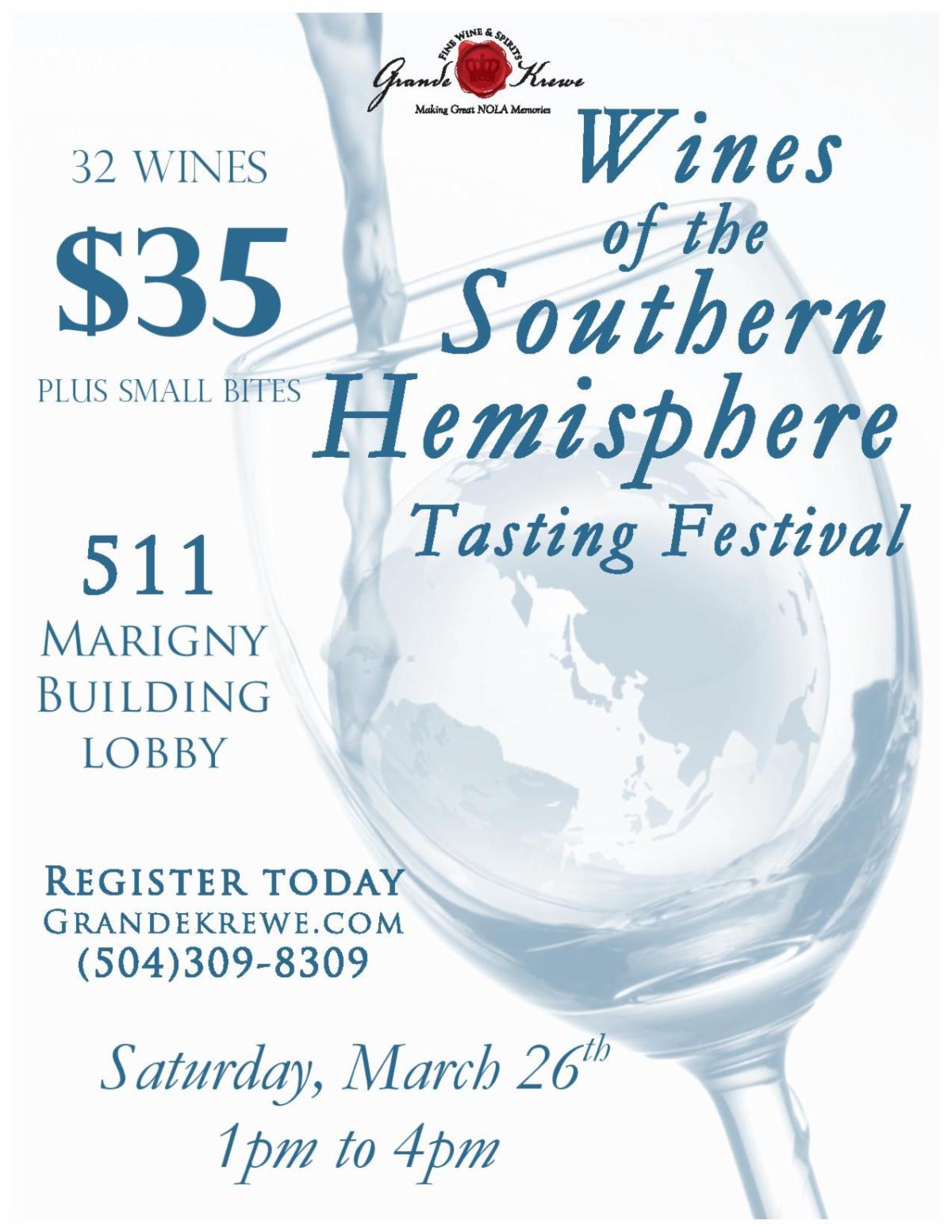 Join us in the lobby of the 511 Marigny building on Saturday, March 26th from 1:00 pm to 4:00 pm to try 32 wines from the southern hemisphere! We'll have four of our favorite wine purveyors pouring and educating us on the wines of South America, South Africa, Australia and New Zealand along with small bites for pairing! This is our premier event of the spring and a great way to learn about these fantastic "new world" wines and winemakers! At $35 per person, these spots will sell out fast so sign up now!