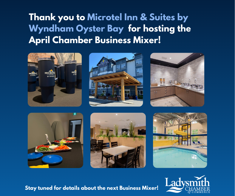 | | Thank you to the Microtel Inn & Suites Oyster Bay, BC for hosting our April Chamber Business Mixer! We had a great time making connections and enjoying one of their lovely conference rooms! | | WELCOME NEW CHAMBER MEMBERS | | |