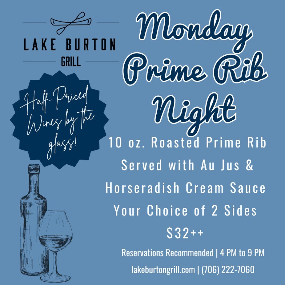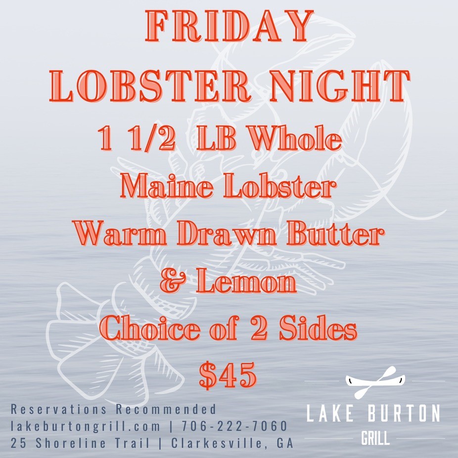 Looking for a fantastic dining experience? You should definitely check out Lake Burton Grill! On Friday evenings, they are serving up succulent Maine Lobster with warm butter, and on Monday evenings, they are offering delicious Prime Rib with Au Jus. Don't wait any longer - book your table now by clicking here.