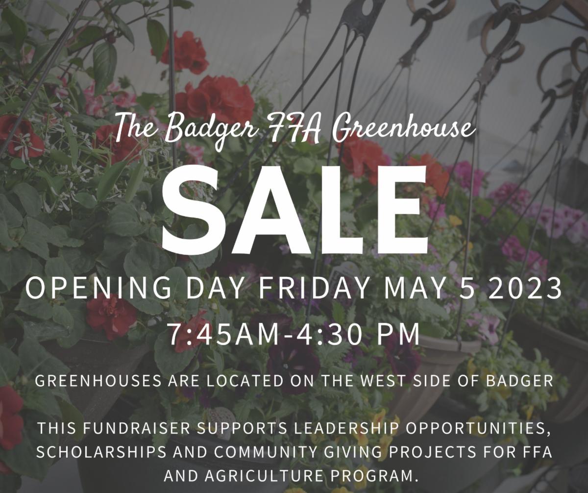 The Badger FFA Greenhouse Sale opening day is Friday, May 5, 2023, from 7:45 am - 4:30 pm. The greenhouses are located on the west side of Badger. For more information, follow Badger Agriscience & FFA on Facebook!