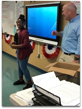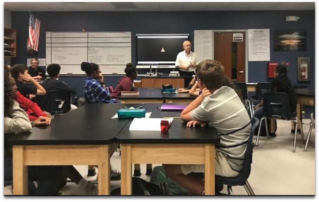 Mr. Jay Honeycutt (former KSC Director) and Mr. Michael McCulley (Astronaut, Atlantis Shuttle Orbiter Pilot, Captain USN, Ret.) in Mr. Menard's 7th grade class.