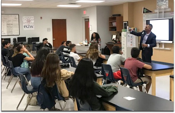 Dr. David Lach (Orthodontist) with 3 associates in Ms. Colon's 8th grade class.