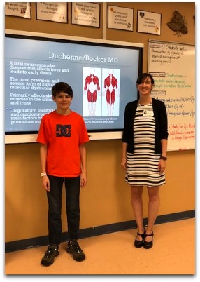Dr. Ryan and son in Science class. Dr. Ryan discussed areas of research in muscular dystrophy with 6th grade Science students