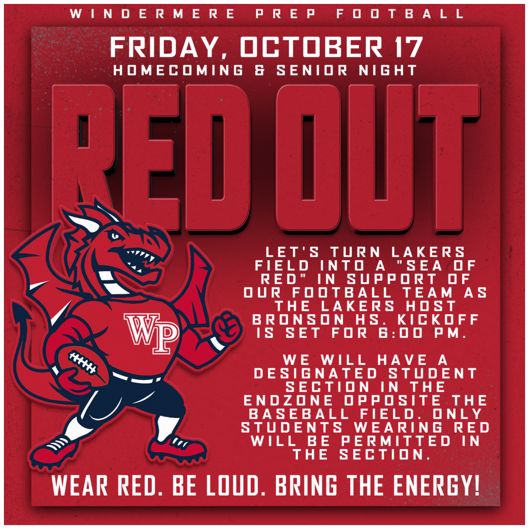 This year, we’re calling on our entire community to “Red Out” the stands. We want to see a sea of red filling every seat as we rally behind our Lakers under the Friday night lights. Whether you’re a student, parent, alum, faculty member, or friend of the program, your presence and energy make this night unforgettable.