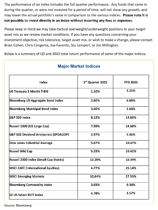 | | Please remember that all investments carry some level of risk, including the potential loss of principal invested. They do not typically grow at an even rate of return and may experience negative growth. As with any type of portfolio structuring, attempting to reduce risk and increase return could, at certain times, unintentionally reduce returns. | | Below is the Q3 '25 total return performance of some of the major indices: | |