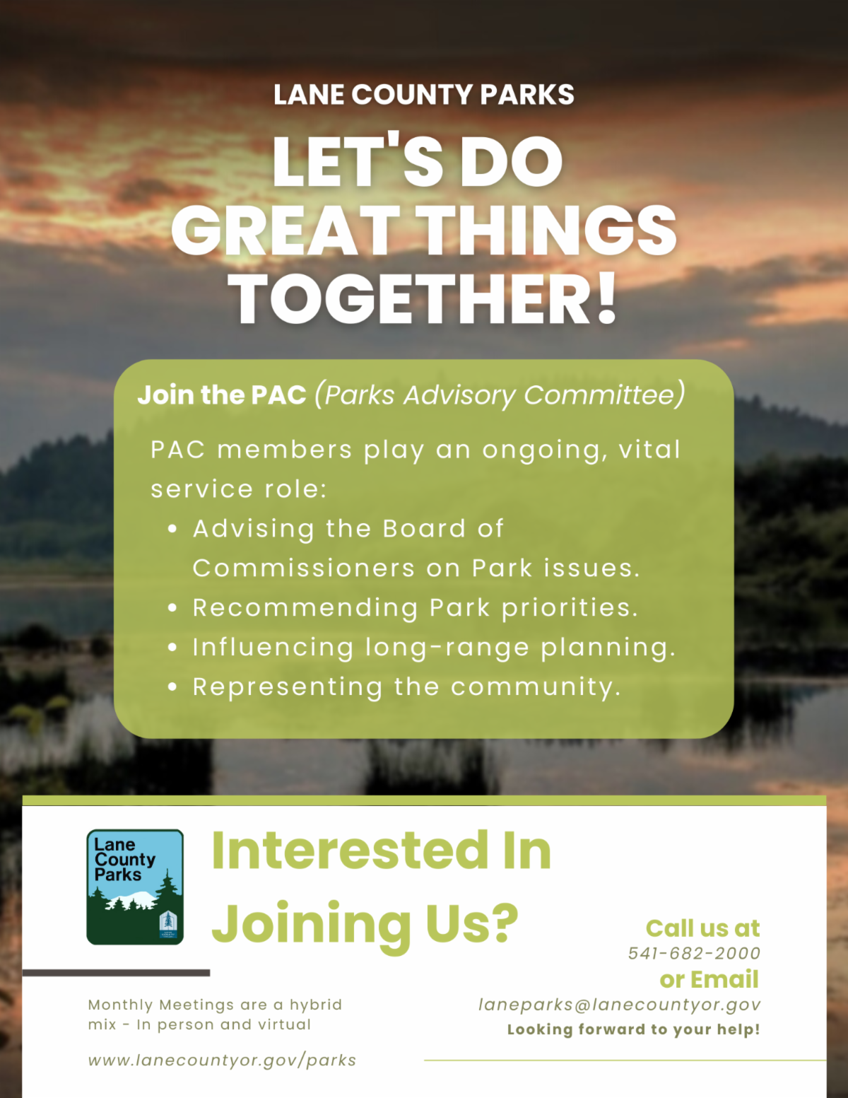 When we first embarked on the journey to create more a sustainable funding source for Lane County Parks, we knew it would be a momentous task. We could not be more excited by the overwhelming public support and public benefits to come as a result of passing the first local option levy in support of Lane County Parks. We are convinced that this achievement is due, in large part, to park supporters like you.   Leading up to the November 2022 vote, you answered surveys, attended public meetings, and acted as ambassadors. You were generous in sharing your ideas and collaborating with staff and other members of the community to prioritize projects for the greatest long-term public benefit. Together, we developed a shared vision for a safe, clean, green County Park system for residents from all backgrounds, lifestyles and abilities to enjoy. Lastly, and perhaps most importantly, you spoke out to educate voters about the value of a sustainably funded County Park system.   With this funding, Lane County Parks can further protect and improve the assets we have, including addressing a backlog of deferred maintenance, increasing safety through a partnership with the Lane County Sheriff, and hiring more park rangers. By leveraging these funds, in partnership with the Lane County Parks Advisory Committee and the Lane County Board of County Commissioners, we see a bright future ahead! Thank you for helping us to get to this moment!   Where do we go from here? Levy monies will be collected through the Lane County Tax Assessor’s office and available in early 2024. In the meantime, we encourage and welcome your continued support by: