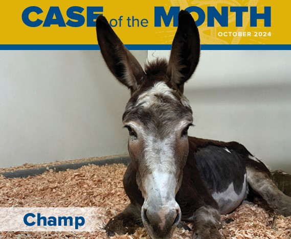 Champ, a 5-year-old gelding donkey, is one of nearly 200 animals at Oscar’s Place Adoption Center & Sanctuary, a ranch in Hopland, California that saves donkeys from slaughter, abuse, and other inhospitable environments. When he arrived at UC Davis, Champ had hypersalivation, weakness, and decreased gut sounds. He was unable to grasp, chew, or swallow any type of food. After multiple tests including bloodwork, ultrasound, and a muscle biopsy, it was revealed that Champ had masseter myodegeneration brought on by selenium deficiency. The Equine Internal Medicine Service improved Champs’ condition with medical management and supportive therapy, and after several days in the Intensive Care Unit, Champ’s muscle inflammation was under control. After discharge, Champ was adopted along with two other donkeys with whom he bonded.