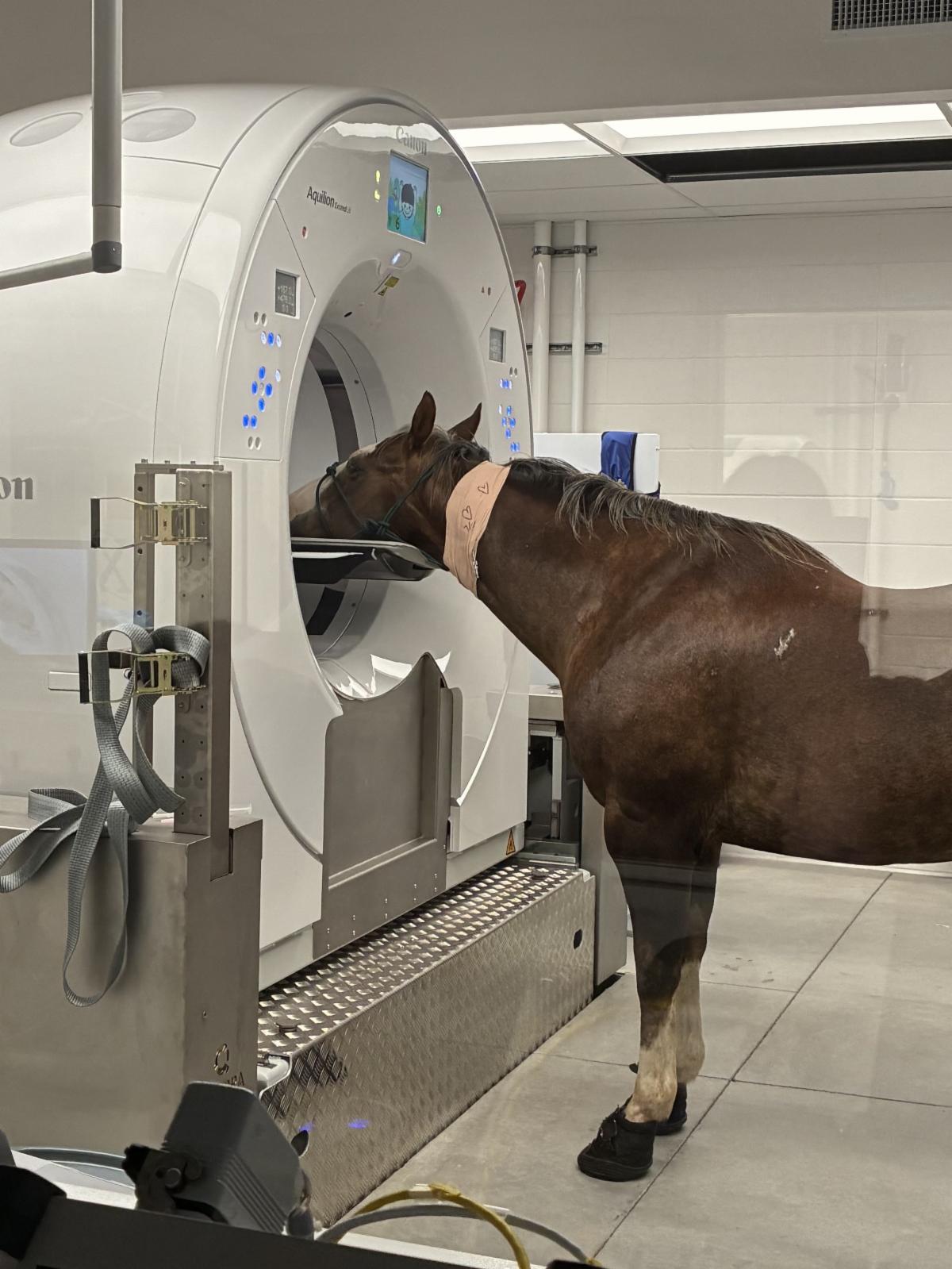 Joe Juice, a 19-year-old American Quarter Horse gelding, was fortunate to be in need of imaging at the same time the Diagnostic Imaging Service was testing new equipment before the opening of the All Species Imaging Center this past summer. A suspected sialolith was confirmed on the right side of his face following a scan in the hospital’s new large bore equine CT. Joe Juice was able to be scanned standing using only mild sedation. Equine Surgeons were then able to remove the sialolith with a standing surgery that also only required sedation instead of full anesthesia.