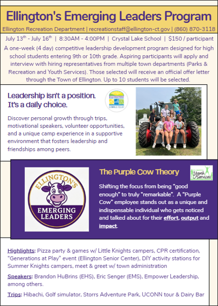 We're Hiring Summer Lifeguards | | Looking for a great summer job? Join our team as a Lifeguard! We offer competitive starting wages and will reimburse the cost of lifeguard certification (up to $300) for qualified hires. It’s a fun, rewarding way to spend the summer while gaining valuable skills and experience. Reach out to our aquatic director at the link below or at mbartley@ellington-ct.gov to get your application started and make a difference this summer! | | Ellington's Emerging Leaders | | All new week long summer camp experience designed to develop our next generation of leaders! | | Ellington’s Emerging Leaders Program is a one-week, hands-on leadership experience designed for motivated students entering 9th or 10th grade who want to make a difference in their community. This engaging program features a selective but supportive application process, designed to be positive and encouraging for all applicants. The program blends leadership development, team-building activities, guest speakers, volunteer opportunities, and exciting trips in a fun environment. With only 10 spots available, interested students are encouraged to apply for this unique opportunity to build skills. The application period opens later this month! | | | |